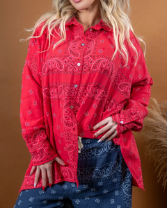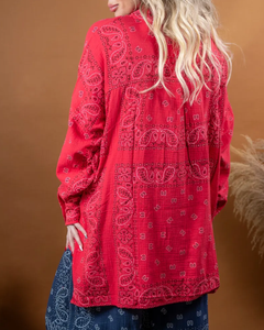 Loose cut body with long sleeves, shirt collar, and classic bandana print make this the perfect layering piece for the hot weather.