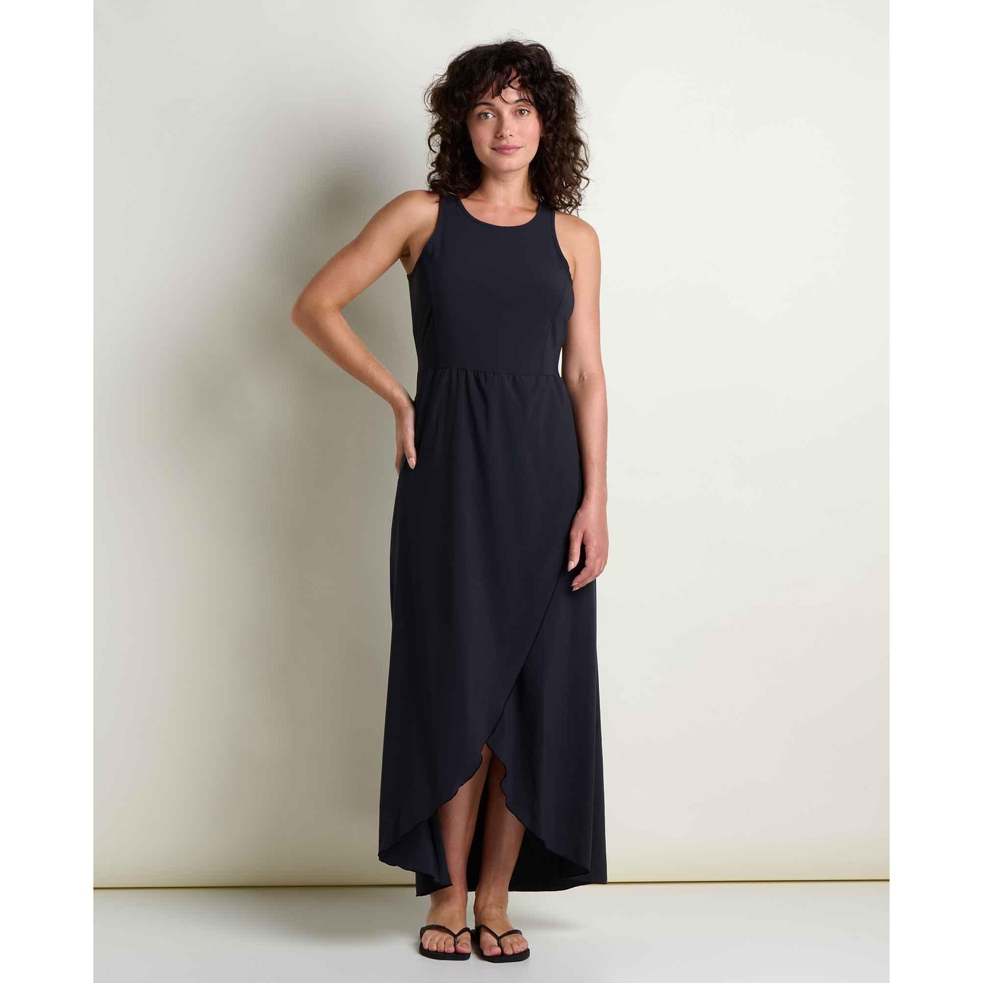 Fit: A-line silhouette, crew neck, bra-friendly straps, cutaway skirt, maxi length.
