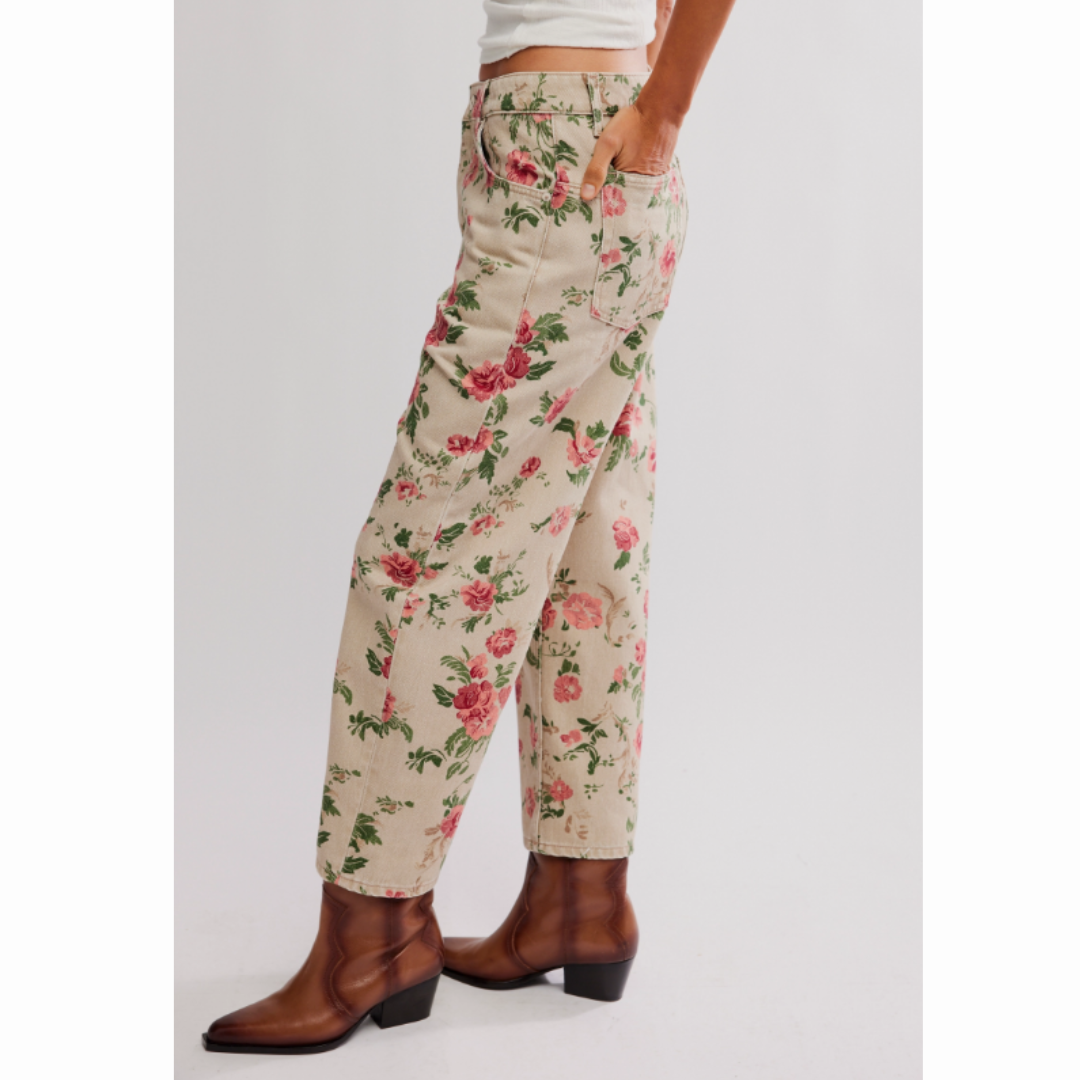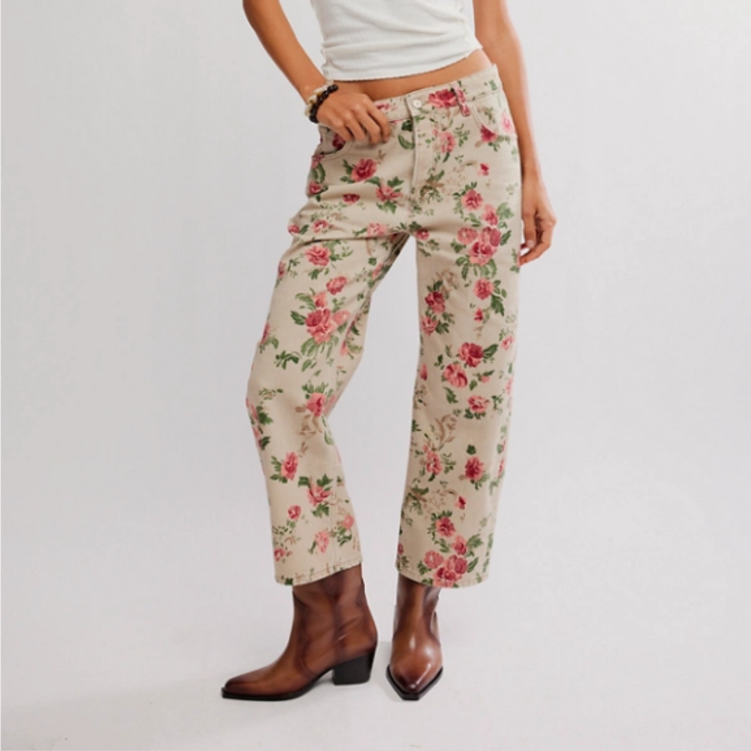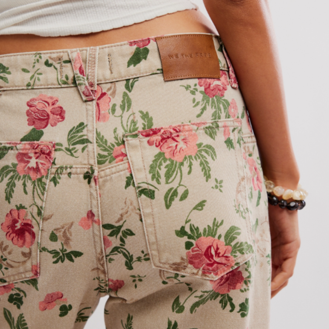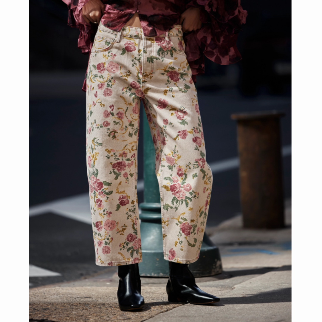 100% cotton ankle length jeans with a very feminine wallpaper floral print. Add a touch of romance to your outfit.