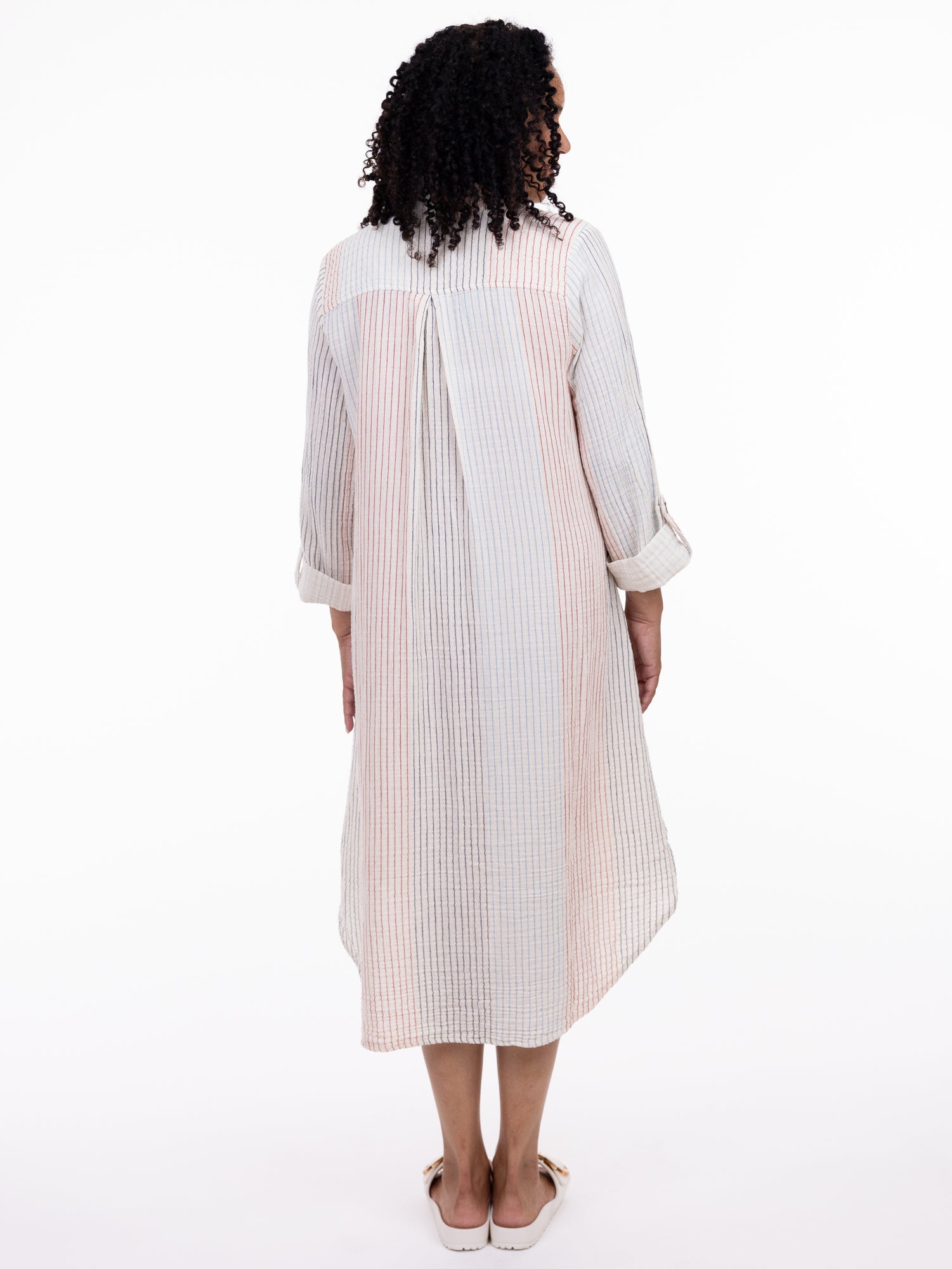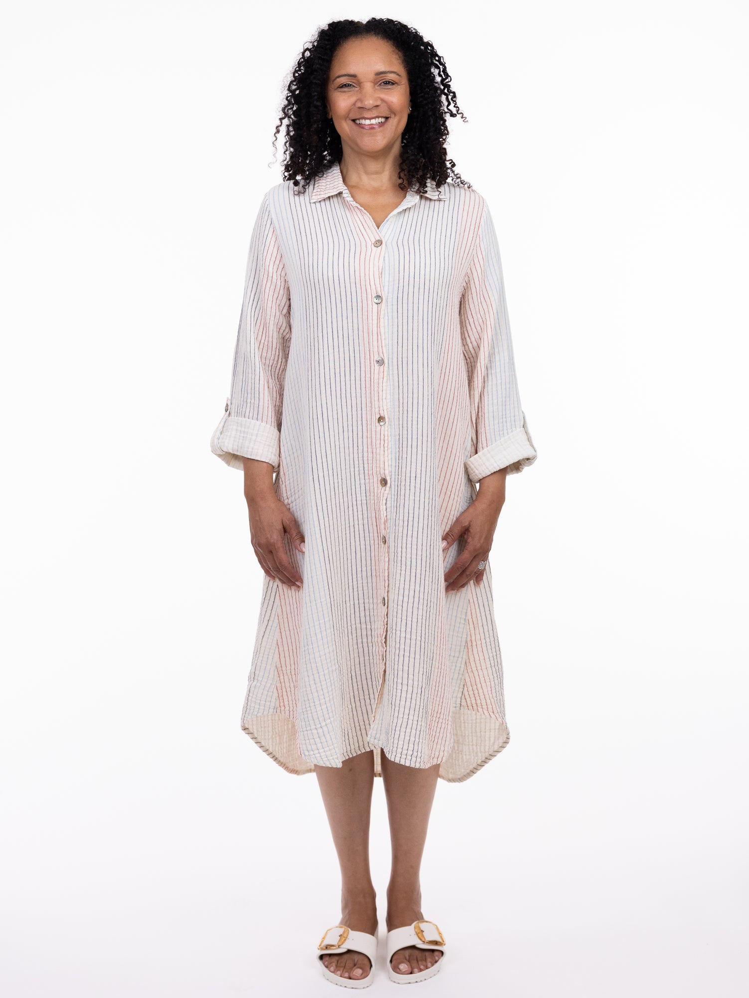 Effortlessly relaxed and beautifully lightweight, this shirt dress is the definition of easy everyday style. Designed with a flattering button-front placket, subtle vertical stripe detail, and a gently flowing silhouette, it offers comfort without compromising polish. The rolled sleeves and functional side pockets add a casual, practical touch, while the fabric gives it that perfectly lived-in feel.
