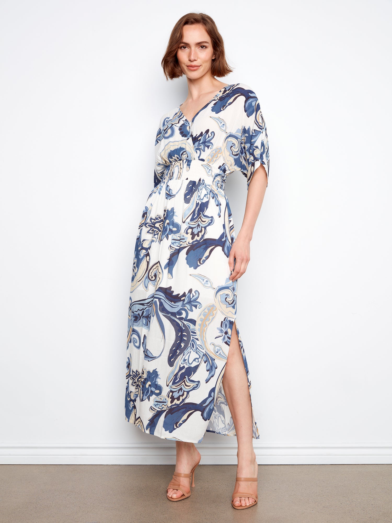 Effortless elegance meets comfort in this printed maxi dress. Dolman sleeves and faux wrap design create flattering movement for any occasion.