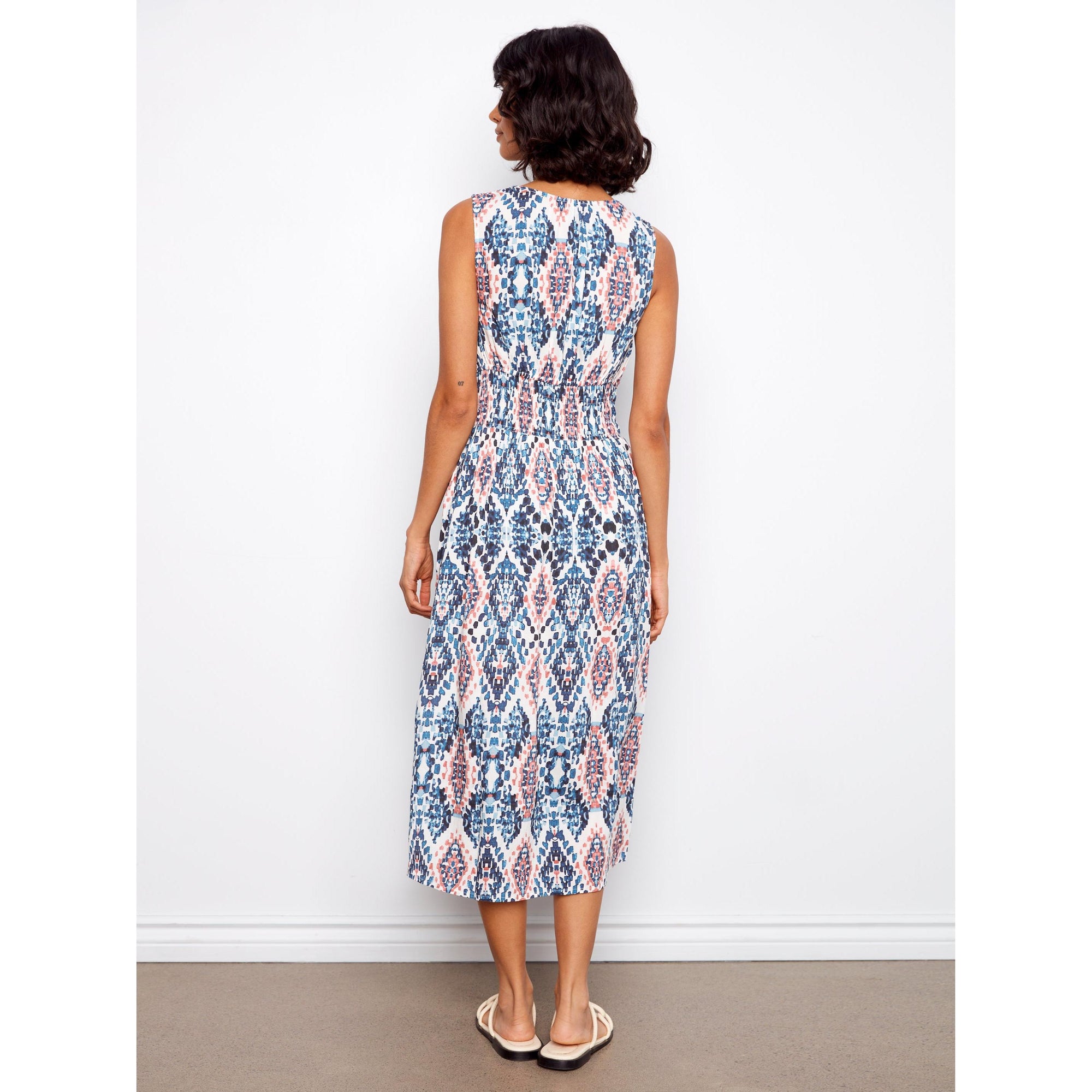 This midi length sleeveless dress is perfect for your next holiday! Its lightweight and airy design will keep you cool and comfortable. The soft cut v-neck and pinched waist adds a touch of elegance. A must-have for any warm weather getaway!