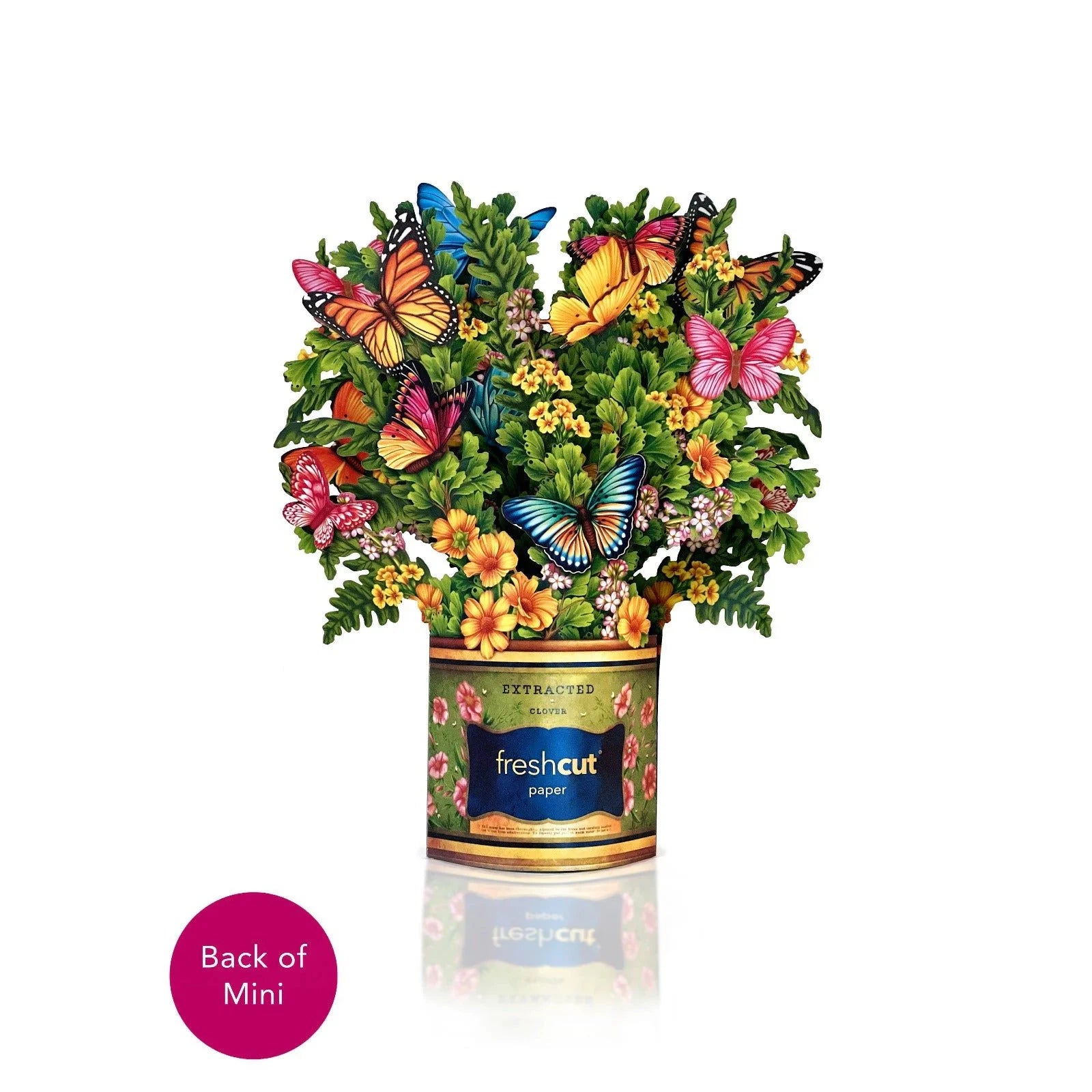 With a kaleidoscope of butterfly varieties fluttering through lush ferns and sweet buttercups, the Mini Butterflies and Buttercups Bouquet energizes every space in small bursts of freshness. The perfect gift to make hearts flutter, this mini bouquet will have you floating like a butterfly all year long. Each bouquet comes with a blank, 2.5" x 3.5" notecard.