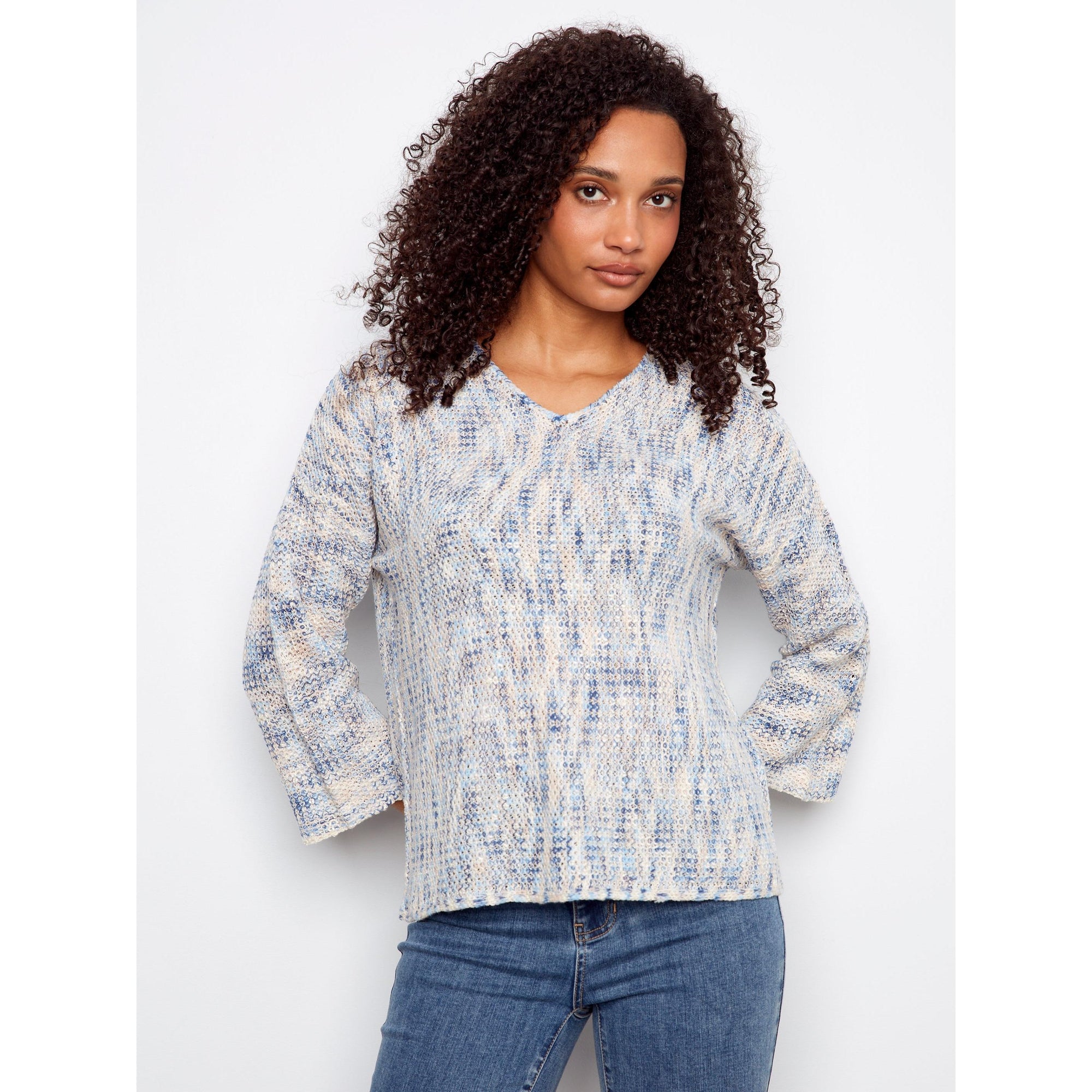 Breezy, soft, and effortlessly chic, this open-knit V-neck sweater is your go-to layer for cozy comfort with a modern twist. Featuring a relaxed fit and dropped shoulders and 3/4 sleeves, it drapes beautifully in shades of blue, white, and cream, making it perfect for layering over tees, tanks, or dresses. Light, airy, and timeless, it’s the sweater that feels like an easy hug on any day.